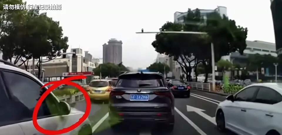 视频里还有个画面,一辆黄色轿车强行加塞,直接把旁边车的后视镜给蹭掉了。