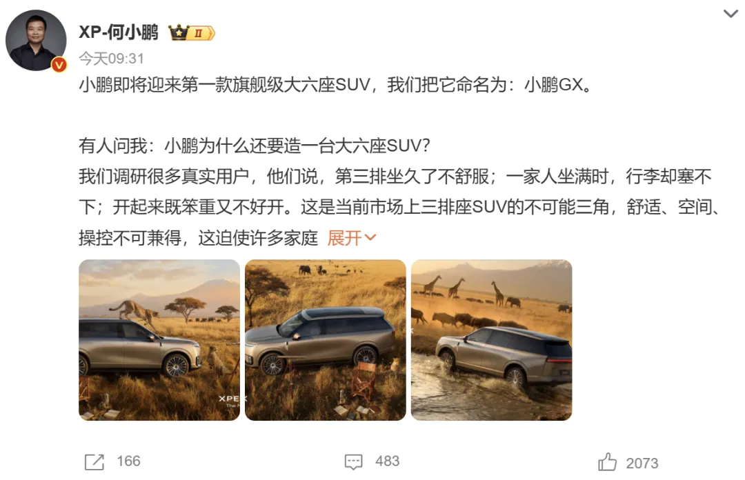 2月5日,小鹏汽车对外发布全新旗舰SUV车型官图,并将新车定名为——小鹏GX。小鹏汽车表示,新车基于全新的SEPA 3.0物理AI整车架构打造,定位AI新豪华大六座SUV旗舰,搭载线控转向和后轮转向的AI底盘。小鹏汽车董事长、CEO何小鹏解释,新车研发代号为G01,“1”代表从“第一性原理”出发,用完整的AI思维,重新设计一台全尺寸家用旗舰SUV;“X”代表对出行美好未知的探索(eXploration),更代表小鹏骨子里的科技基因(X-tech)——坚持用技术,彻底解决问题。