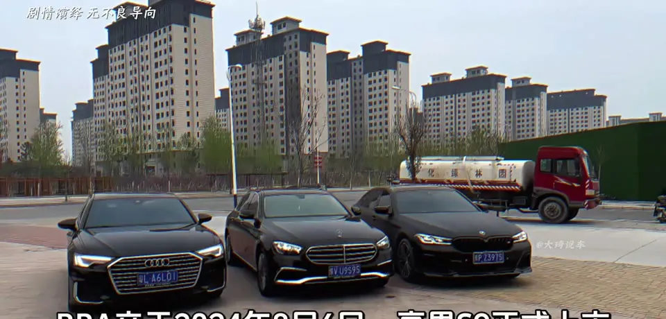 三辆黑色BBA轿车并排停放,与享界S9的上市形成对比。