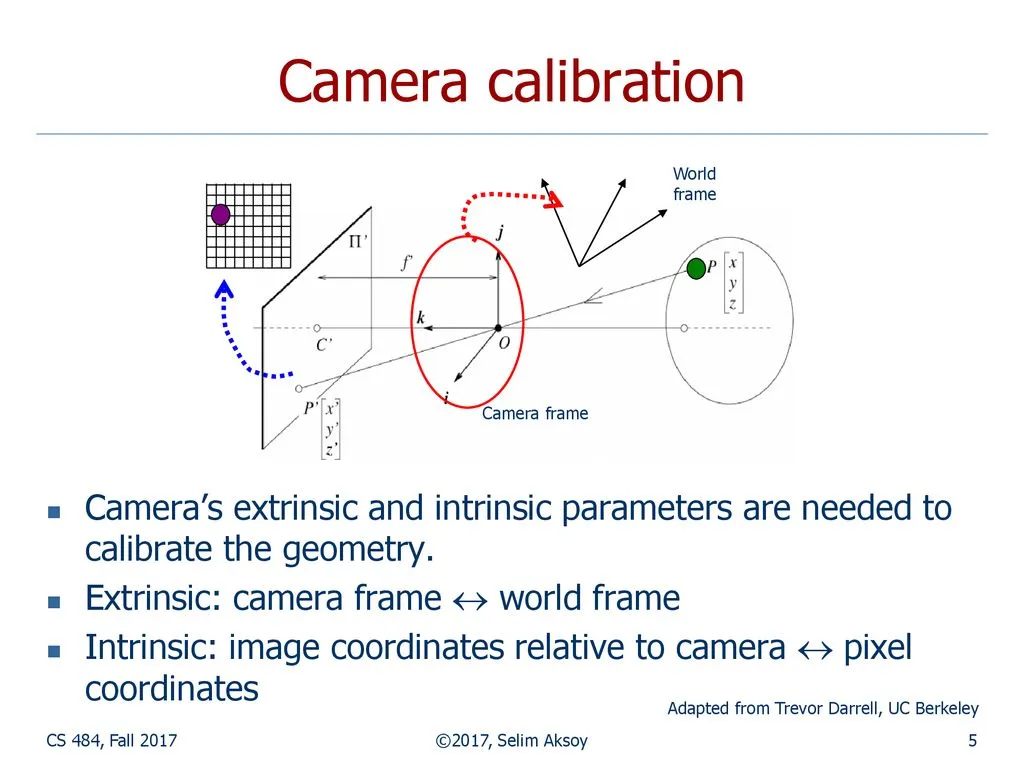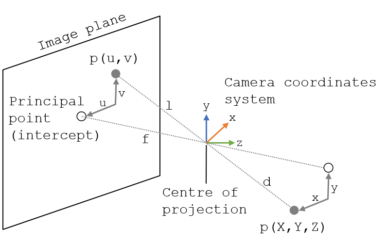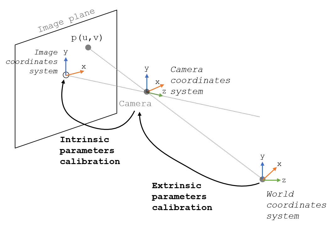 为了将相机坐标映射到像素坐标(以便在真实世界中映射虚拟物体),我们需要找到相机的内在参数。下图展示了相机校准中涉及的元素。