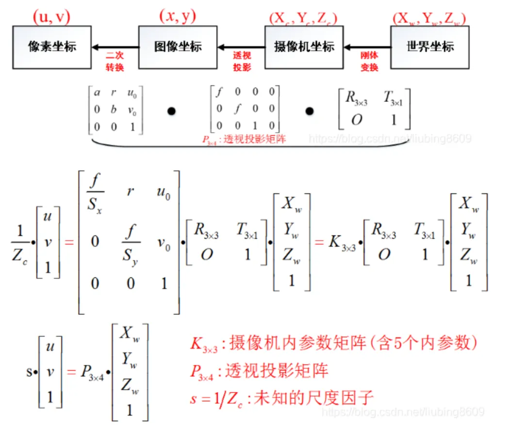 其中s为缩放因子,[R t]为相机的外部参数(R为相机相对于世界坐标系的旋转,t为平移),K对应相机的内部参数,其定义如下: