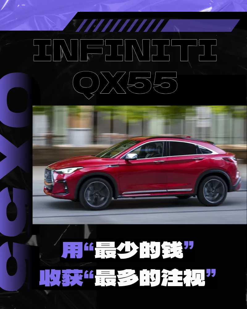 不想在红绿灯前和别人“撞衫”?那么QX55绝对是你的最佳选择!用普通家用车的月供,换来豪华轿跑 SUV 的注视礼,这就是你脱颖而出的最佳时机。