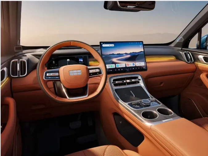坐进车内,材料堆得挺讲究:生态麂皮大面积覆盖,自然木纹饰板,水晶质感旋钮,配色不浮夸。中控是全液晶仪表+悬浮式中控屏的常见组合,搭载Flyme Auto,这套系统在流畅性和交互逻辑上口碑不错,和手机跨端生态连起来会更顺手。