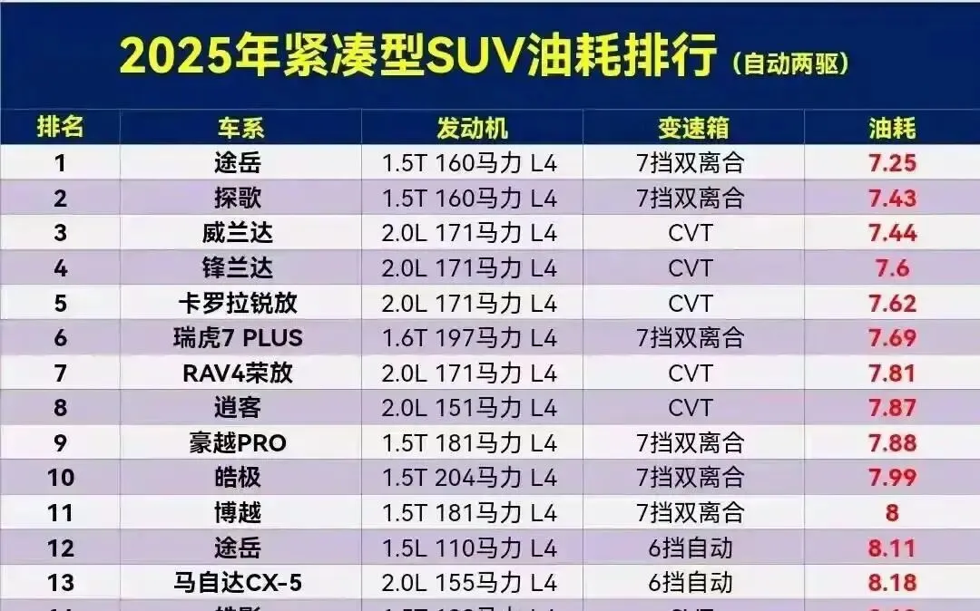 2025紧凑型SUV油耗榜刚出炉,大众途岳凭7.25L/百公里的成绩杀到榜首!