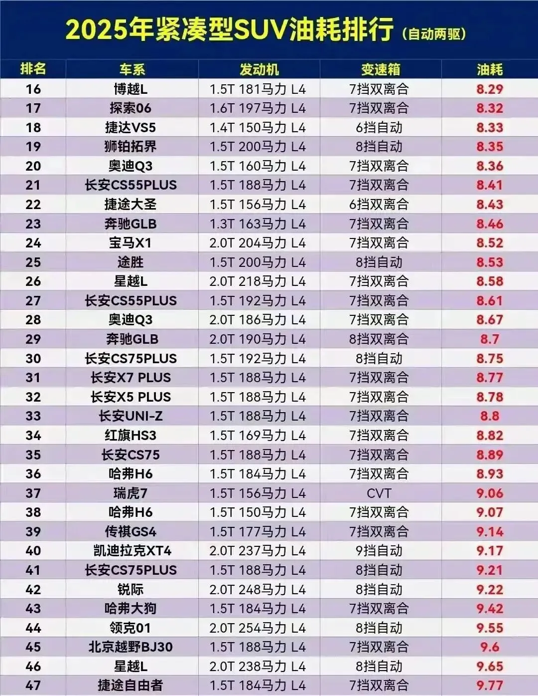 但一到长安CS75PLUS(排第51,10.18L)、哈弗大狗(第43,9.8L),直接原地暴毙。