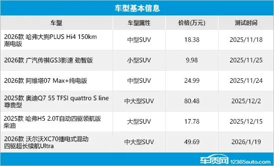 本期选取的6款车型包括1款小型SUV、2款中型SUV、2款中大型SUV和1款大型SUV,涵盖自主、合资以及进口车型,既有传统燃油车,也有新能源车。