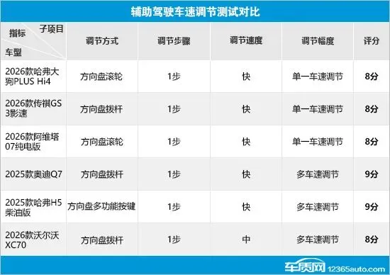 在辅助驾驶车速调节测试对比中,6款车型的整体表现符合预期。虽然调节方式存在差异,但是在调节步骤方面表现一致,调节速度上也仅有沃尔沃XC70稍稍落后。而在调节幅度方面,哈弗大狗PLUS Hi4、2026款传祺GS3影速(以下简称:传祺GS3影速)和阿维塔07纯电版不支持多车速调节,导致出现失分情况。