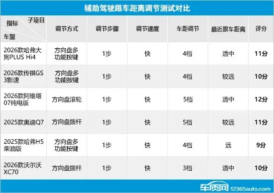 在辅助驾驶跟车距离调节测试对比中,6款车型的调节步骤均为1步,且调节速度表现出色。不过在车距调节方面,仅阿维塔07纯电版和奥迪Q7支持5档车距调节,而沃尔沃XC70只有3档,表现较差。此外,哈弗H5柴油版的最近跟车距离不够理想,扣分最多。