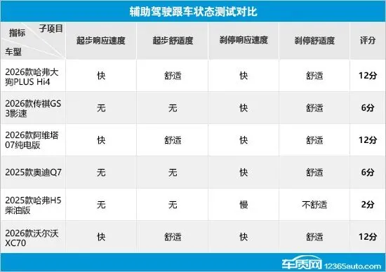 在辅助驾驶跟车状态测试对比中,哈弗H5柴油版表现不佳,不仅不支持自动跟车起步功能,刹停响应速度和舒适度也很难令人满意,最终在该环节仅得到2分。哈弗大狗PLUS Hi4、阿维塔07纯电版和沃尔沃XC70表现优异,兼顾了起停的效率和舒适度,均拿到了满分成绩。