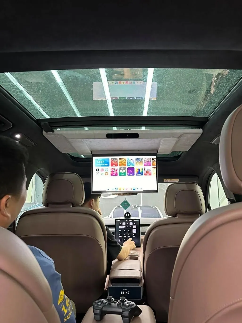 然.后我现在.坐到.第二排,给大家.看一下空间。我身高180,前排是我自.己.的坐姿,二排腿部还有两拳多,头顶差.不多还有一拳。这个.靠背角度.我再往.后调一下,挺舒服的,适合长途。地板.中间有一点.凸起,但不高,坐中.间的也能接受。靠背中间是扶手,带两个.杯架,整体质感.比.较稳重。后排还有独.立.空调、座椅加热、通风这些都有,不过我发现.一个小槽点——充电口.只有一个Type-C,要是两个就更完美了。