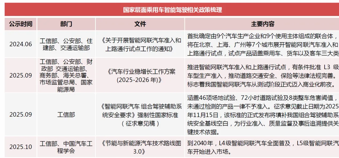 政策端持续赋能,推动汽车产业智能化升级。2024年6月,工信部发布《四部门有序开展智能网联汽车准入和上路通行试点》的通知,公布9家首批智能网联汽车准入和上路通行试点联合体。2025年10月,由工信部指导、中国汽车工程学会组织修订编制的《节能与新能源汽车技术路线图3.0》提出到2040年,L4级智能网联汽车全面普及,L5级智能网联汽车开始进入市场。2025年12月,工信部正式公布我国首批L3级有条件自动驾驶车型准入许可。