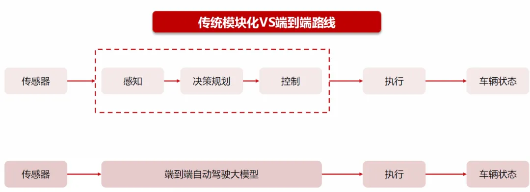 2)端到端技术路线,将多个功能模块整合到统一的神经网络模型,实现了从传感器侧的数据采集到车辆控制指令发出的直接映射,能够减少模块间协同环节,显著提升信息流通效率。