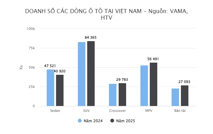根据VAMA的预测,2025年越南SUV总销量预计达84365辆,较2024年增加1363辆,同比增幅1.6%;跨界车销量预计达29783辆,小幅增加860辆;MPV销量预计达43100辆,同比增幅6.2%。
