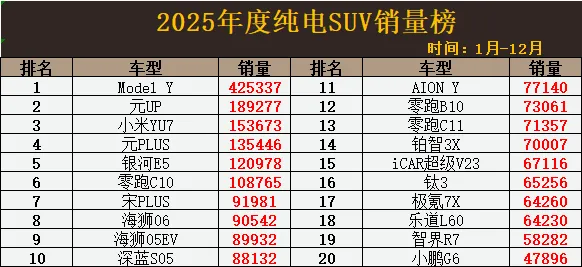 再次大胜!2025年度纯电SUV销量榜出炉:BYD前10占5,小米YU7第3,智界R7第19