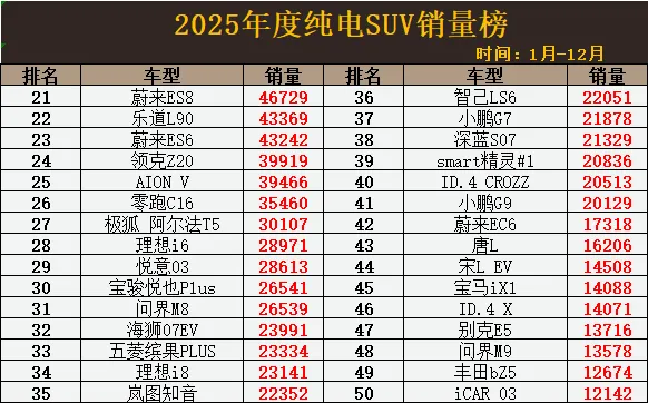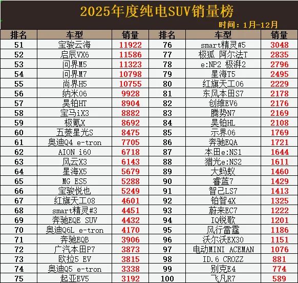 在新能源车销量不断扩张,市占率持续攀升的当下,作为旗下最大细分市场之一的纯电车的贡献尤其巨大,特别是在SUV领域,纯电车在市场争夺中已能与燃油车正面抗衡,并且有逐步领先的趋势,而这其中不仅有迅速发展的新势力的功劳,而作为最大新能源车企的的比亚迪则是最大的贡献者。据2025年度纯电SUV销量榜显示,在榜单前10名中比亚迪上榜5款,占据着头部车型的半壁江山,不过纯电SUV市场的最大巨头非Model Y莫属,自上市以来其在纯电SUV市场的销冠就没丢过,自2023年以来年度销量还没有跌破过40万辆,可谓是现象级的存在。除此之外,小米YU7成为又一批销量黑马,虽6月底才上市,但排名已闯进榜单前3,银河E5、深蓝S05均位居前列,华为系的重磅纯电车型智界R7也有不俗表现,排名跻身榜单前20名,月均销量已来到5000辆左右。首先,在榜单前20名中,有6款车型年度销量超10万辆,Model Y以42.5万辆的惊艳成绩夺得销冠,元UP、小米YU7紧随其后,元PLUS、银河E5都超12万辆,零跑C10也以出色的表现反超宋PLUS和海狮06这样的明星车型,深蓝S05销量突破8.8万辆,铂智3X、钛3、极氪7X等也都稳居榜单前20名。接下来的第21-50名中,新势力车型占比不断增大,其中蔚来ES8在年底最后两个月的出色发挥下排名成功攀升至第21,乐道L90、蔚来ES6也都超4万辆,零跑C16纯电销量3.5万辆,理想i6、问界M8、理想i8、智己LS6等年销量突破2万辆大关,后续潜力可观,小鹏G9未能入榜前40名,宝马iX1、别克E5、丰田bZ5等合资电车销量均超万辆。榜单最后第51-100中销量表现就比较一般,仅有问界M5、M7、尚界H5等5款车型销量破万,宝马iX3最大幅降价,但销量依旧低迷,2025年度仅售出8882辆,AION i60、风云X3只有6000多辆,奔驰EQB、广汽本田P7、奥迪Q5 e-tron等合资车都不足4000辆,示界06、智己LS7、蔚来EC7等国产车型也不如意,年度销量仅千余辆,表现异常惨淡。