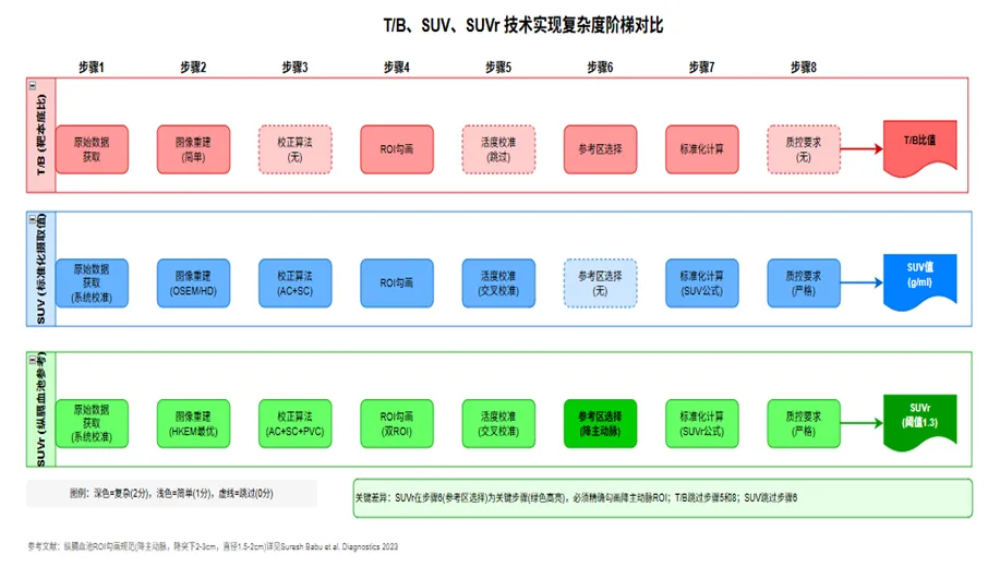 图 1:T/B、SUV、SUVr 三种指标计算流程的复杂度递进关系。