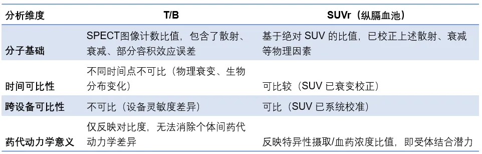 尽管 SUVr 和 T/B 都是"比值",但存在本质差异: