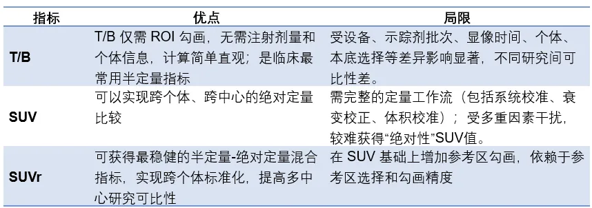 表1 T/B、SUV、SUVr 三种指标优点和局限性