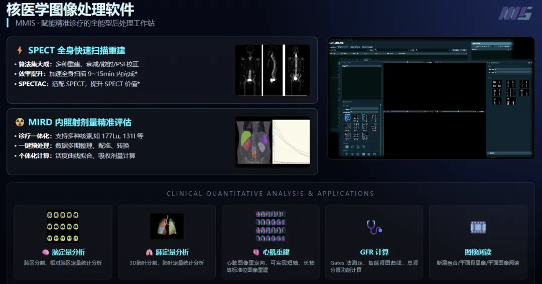 1. 实现高精度绝对定量前提MMIS 内置了PSF校准、衰减校正(AC)和散射校正(SC)等核心算法,能够将传统 SPECT 系统的相对计数转换为具有物理意义的放射活度浓度(Bq/mL)或标准化摄取值(SUV)。通过这些严格的校正步骤,确保了影像的绝对定量精度,为临床研究中剂量评估、药物动力学分析以及多中心数据对比提供可靠的基础。