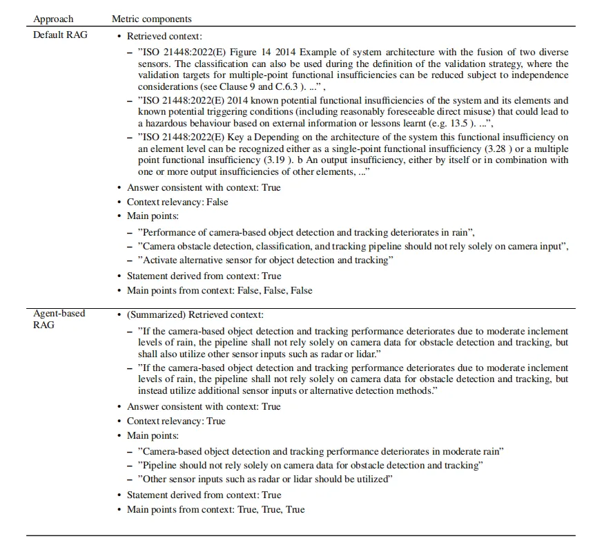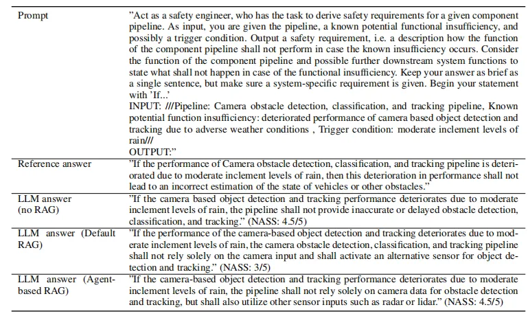 1、两种检索增强生成方法的归一化回答相似度得分相近,甚至与无检索增强生成的纯大语言模型调用方法也相差无几。这表明,平均而言,大语言模型能够利用通用知识生成与正确答案相似度较高的回答。实验进一步验证,采用 BERT 得分等其他相似度指标时,三种方法的结果也仅有微小差异。但对部分示例的分析显示(见表 2),基于检索增强生成的回答包含人类用户认为有用的额外信息。例如,针对降雨导致摄像头系统性能下降的问题,无检索增强生成的大语言模型仅指出,该情况不得导致对其他车辆或障碍物的状态估计出现错误;传统检索增强生成的大语言模型回答则进一步提及应激活备用传感器;而基于智能体的检索增强生成方法的大语言模型回答,还结合阿波罗系统架构,明确了雷达、激光雷达等具体的备用传感器类型,体现出该方法在安全需求推导中捕捉细节的能力。尽管如此,评判大语言模型为所有回答给出的归一化回答相似度得分仍相近。由此可见,归一化回答相似度得分、BERT 得分等相似度指标,无法捕捉到人类审核人员可能关注的细微差异。研究认为,在更复杂的问题场景中,或使用通用知识储备较少的小型大语言模型时,归一化回答相似度得分的区分度会更高。