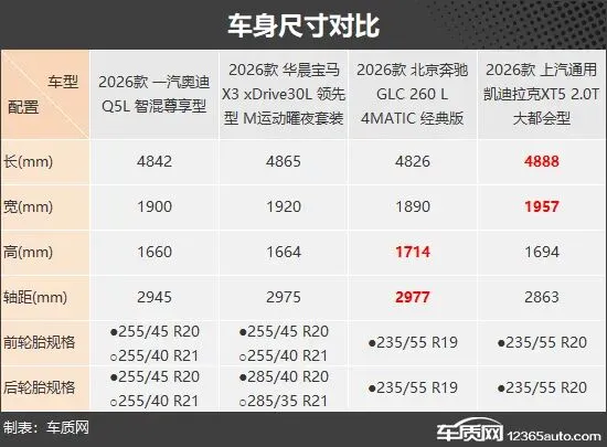 车身尺寸方面,凯迪拉克XT5虽然在车长和车宽上占据一定优势,但由于“BBA”的三款车型均为长轴距版,其轴距表现反而处于明显劣势,后排乘客的腿部空间相对不够宽裕。奔驰GLC L则在车高和轴距上领先,理论上能够为乘员带来更充裕的头部空间。