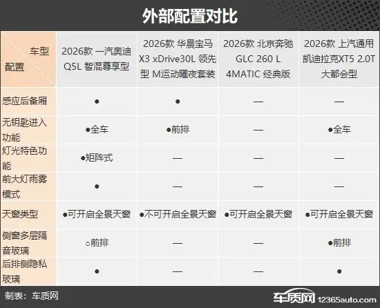 在外部配置方面,奥迪Q5L优势明显,不仅功能丰富,还独享矩阵式灯光特色功能和前大灯雨雾模式,表现堪称全面。凯迪拉克XT5则标配了侧窗多层隔音玻璃,对座舱静谧性起到了积极作用。奔驰GLC L表现不佳,缺失配置较多。