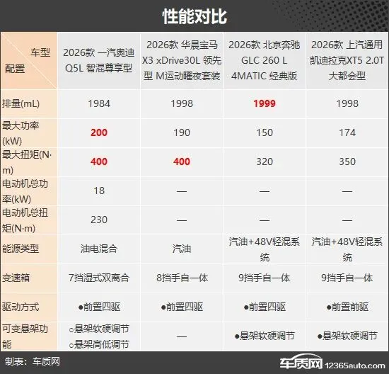 性能方面,四款车型均搭载2.0T涡轮增压发动机,其中仅宝马X3采用纯汽油形式。具体参数层面,奥迪Q5L整体表现占优,动力储备更为充足。奔驰GLC L则在行驶系统上更具特色,是唯一同时配备前置四驱系统与悬架软硬调节的车型,兼顾了行驶稳定性与舒适性表现。