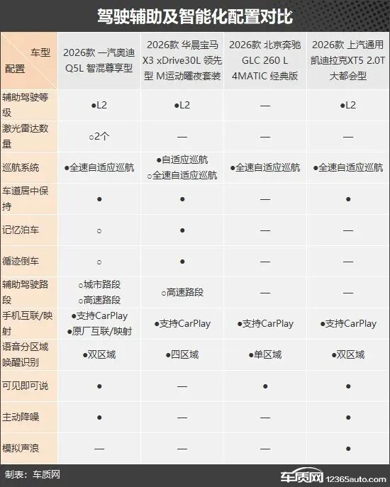 辅助驾驶方面,除奔驰GLC L外,其余三款车型均具备L2级辅助驾驶能力。其中,奥迪Q5L在选装2个激光雷达后,可实现城市及高速路段辅助驾驶,功能上具备更大的拓展潜力。