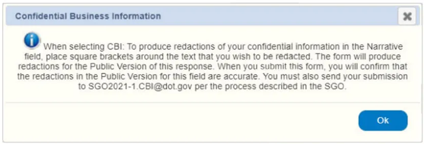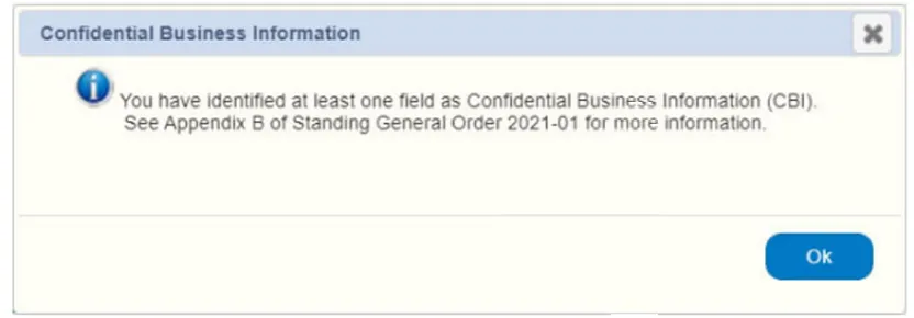 3.若任何一个“CBI” 勾选框被勾选,报告页面顶部将显示 “商业机密信息” 声明,以符合《联邦法规汇编》第 49 编第 512.6 (c)(2) 条的要求。同时,系统将弹出以下提醒信息: