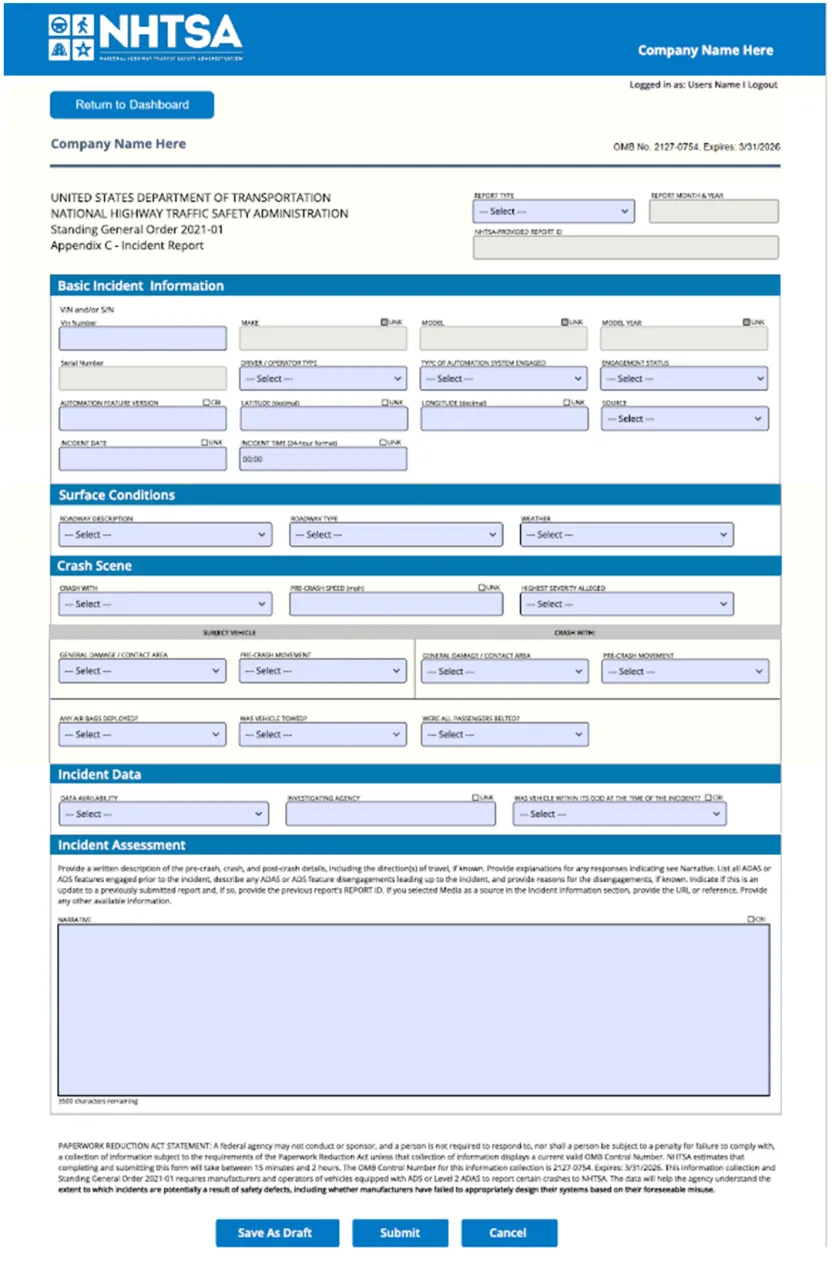 5.若报告类型为“月度报告”,在显示的字段中填写必填数据。填写完成后,可点击 “保存为草稿” 按钮将报告保存为草稿,以便后续编辑或提交;或点击 “提交” 按钮立即向 NHTSA 提交报告;点击 “取消” 按钮返回仪表板;