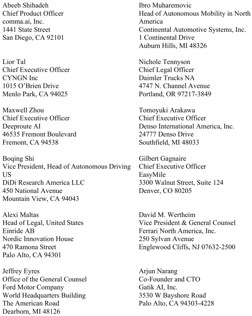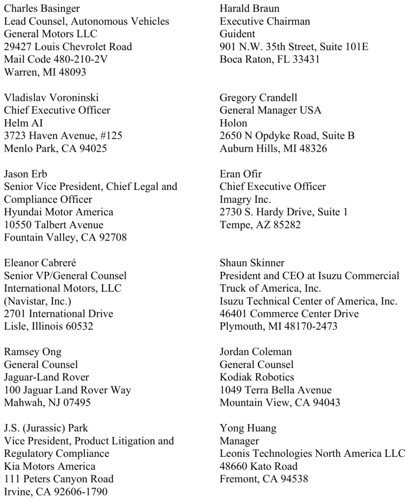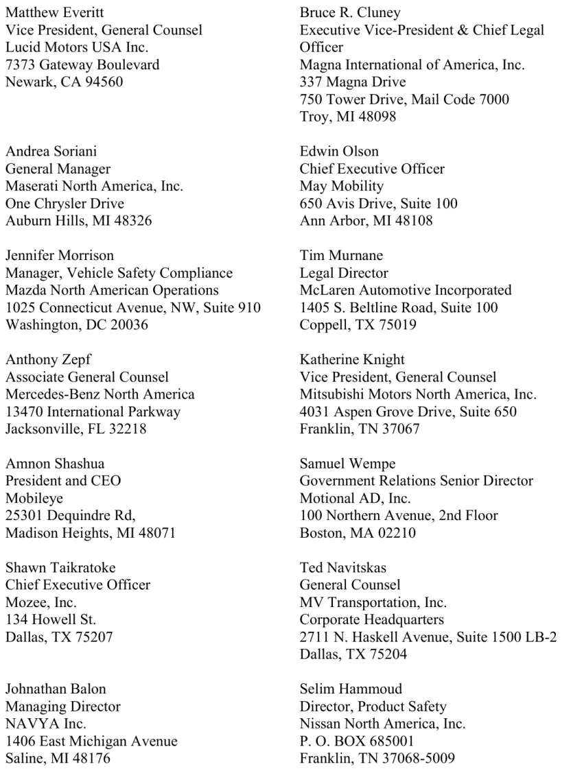 通过本命令,NHTSA 将评估特定制造商(包括原型车及设备制造商)是否履行了法定义务,确保其车辆和设备不存在对机动车安全构成不合理风险的缺陷,或在发现此类安全缺陷时及时实施召回(参见《美国法典》第49编第30112、30118-30120条)。