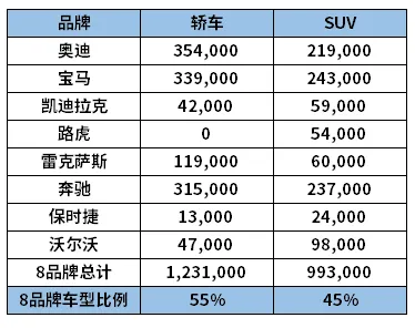 反观传统豪华品牌,我们同样选取头部的8个品牌,可以看到SUV的比例仅45%,更加体现造车工艺的轿车才是销量的大头。如果只看BBA三个品牌,则轿车占比高达60%,百年车企的造车工艺在这里体现得淋漓尽致。轿车的销量和市场认可度碾压所有新势力,BBA靠的不是噱头,是实打实的造车功底,这才是真本事。
