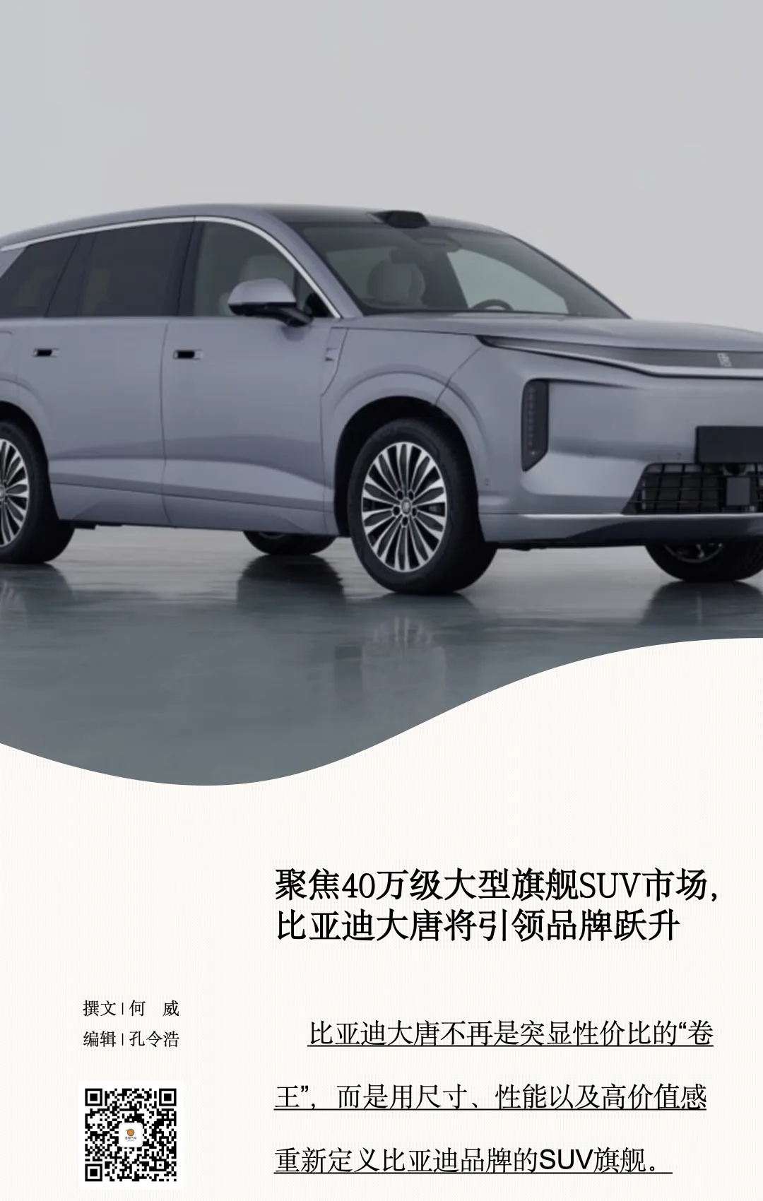 点评:比亚迪大唐的推出,是一次清晰的战略卡位。在20-25万级的唐L之上,比亚迪大唐直接切入40万级大型新能源SUV市场,补全了王朝网的高端拼图。它不再是突显性价比的“卷王”,而是用尺寸、性能以及高价值感重新定义比亚迪品牌的SUV旗舰。比亚迪大唐实质上是在中国车市内卷环境下,肩负着带领比亚迪品牌价值跃升向上的重任。未来,比亚迪的竞争逻辑将从“新能源车普及者”转向在中国车市各细分领域的全维度对标。