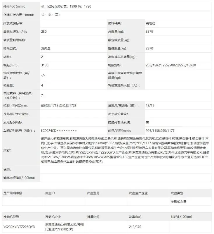 动力部分,比亚迪大唐的先期申报的车型分别有单电机驱动和双电机四驱等多种动力配置。其中,单电机低功率版车型峰值功率输出300kW;单电机低高功率版车型峰值功率输出370kW;双电机四驱版车型综合功率输出 215kW+370kW。电池方面,新车将全系搭载比亚迪磷酸铁锂刀片电池。