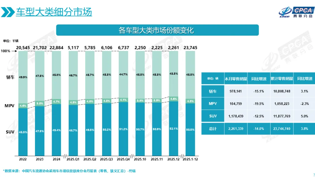 按照乘联会统计的数据,2025年全年,SUV销量同比增长5%,轿车销量同比增长3%,MPV销量同比下滑2.3%。