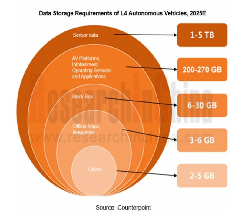 L4系统通常配置激光雷达、4D成像雷达、更多更高清的摄像头等构成的复杂传感器矩阵。这些传感器每小时产生的数据量可高达数TB。