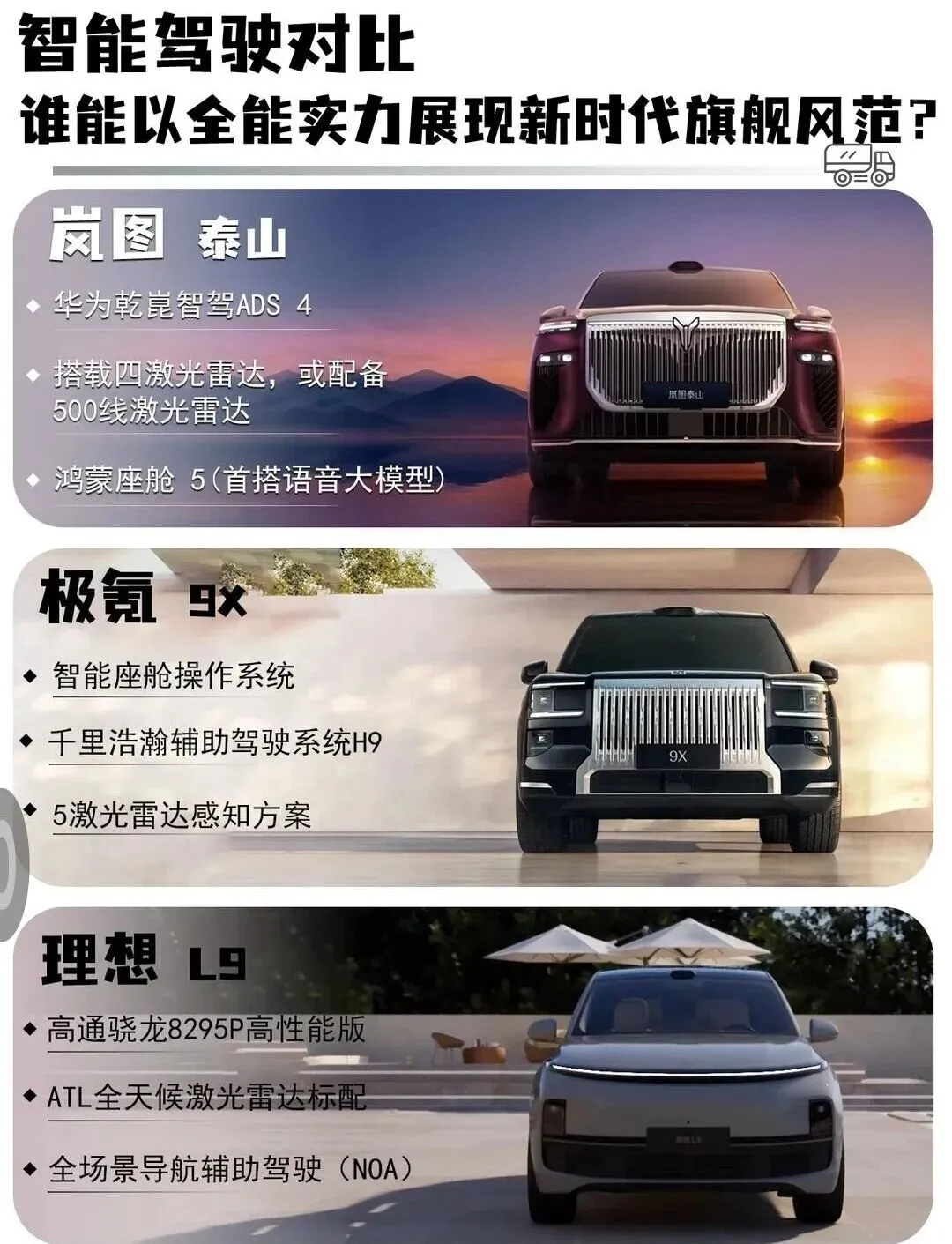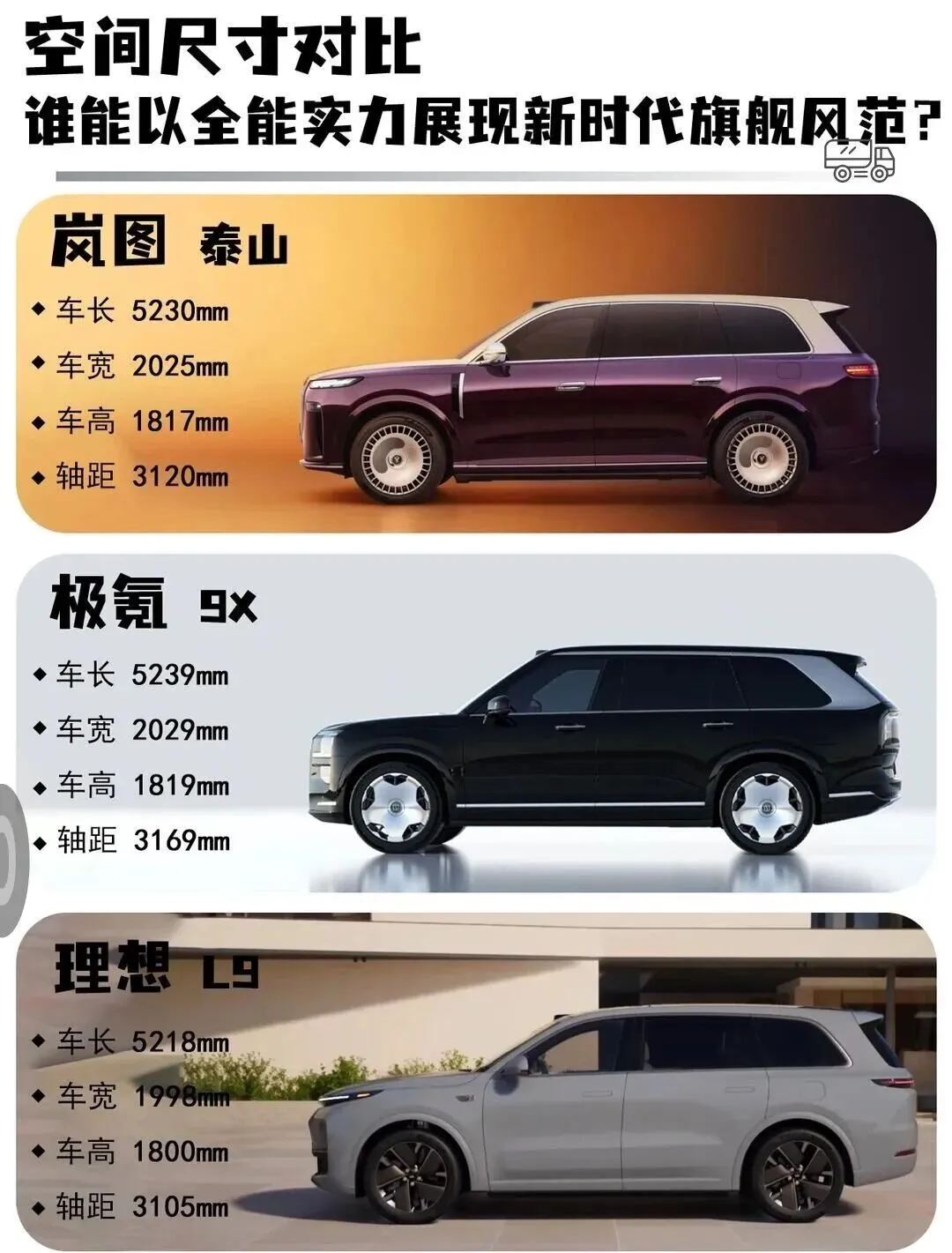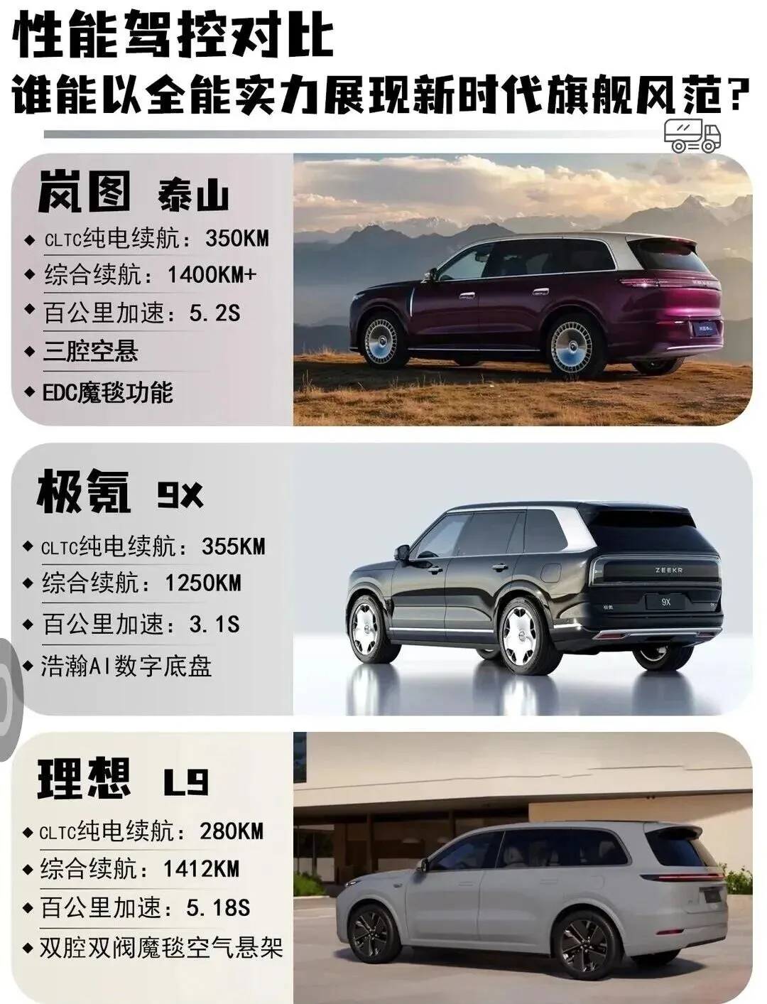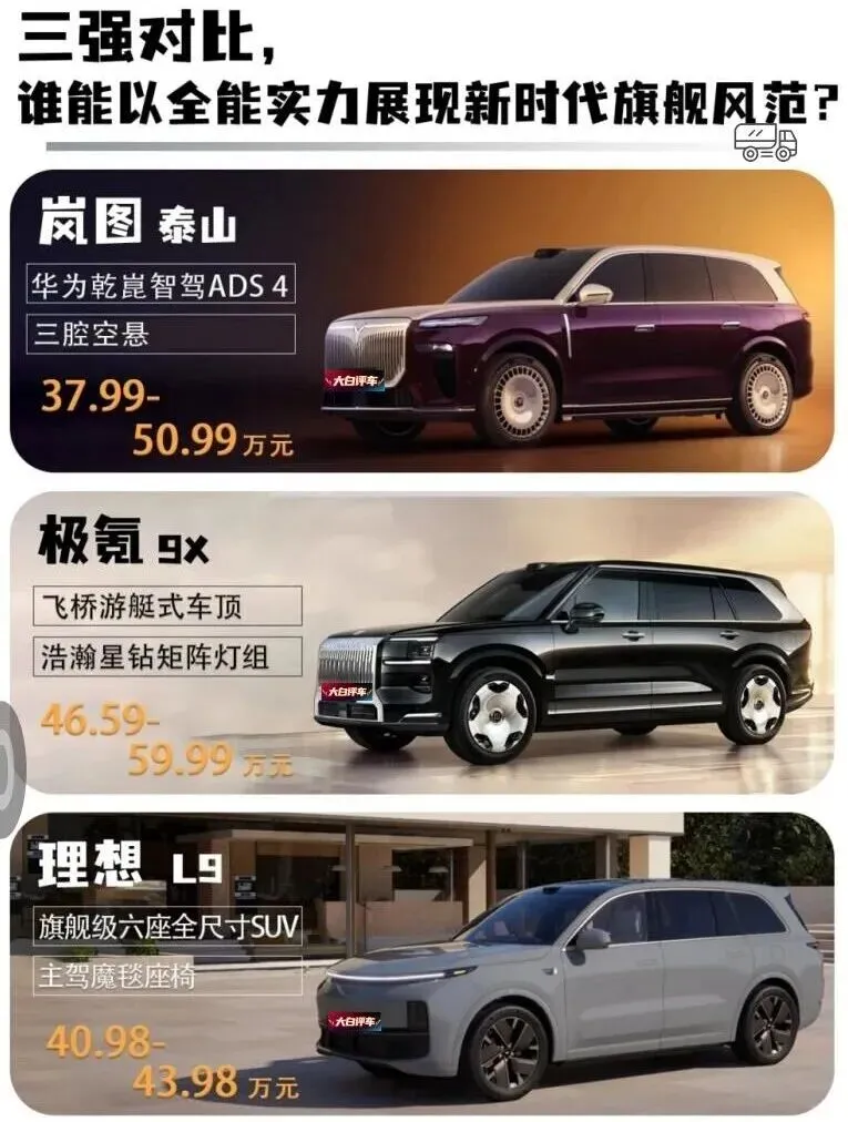 岚图泰山强在空间利用率与技术闭环,极氪9X胜在算力与驾控,理想L9主打家庭舒适实用。