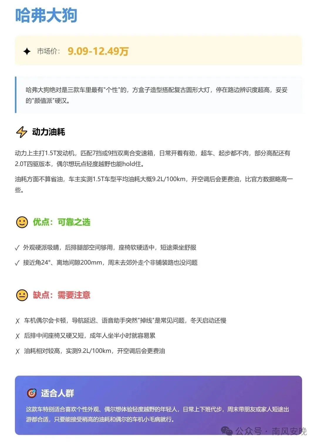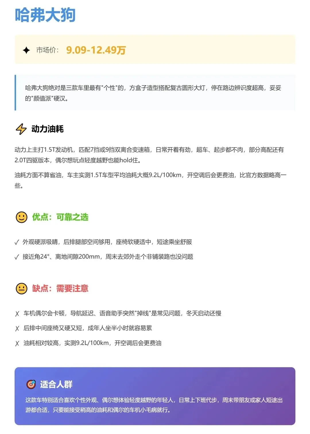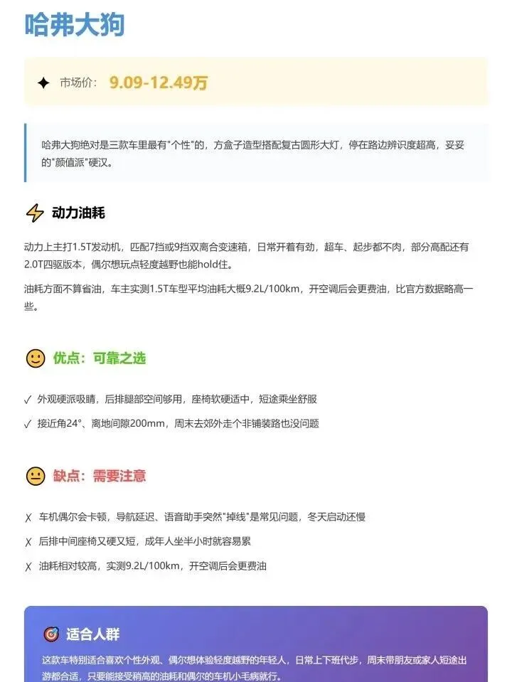哈弗大狗——个性玩家之选适合:年轻人、喜欢露营、偶尔想体验轻度越野的朋友;平时城市通勤,周末带女朋友或家人短途自驾。你要的是**造型有排面儿、偶尔能走点烂路、有点驾驶乐趣**。不适合:天天堵城里、对油耗极其敏感、家里只有这一辆车又要兼顾老人孩子长途舒适的家庭——对你来说,**油耗+后排舒适性,这俩点可能会让你后期有点上火**。这种情况,我的建议是:**大狗好开好玩,但务必试驾+算清油费,再下手。**