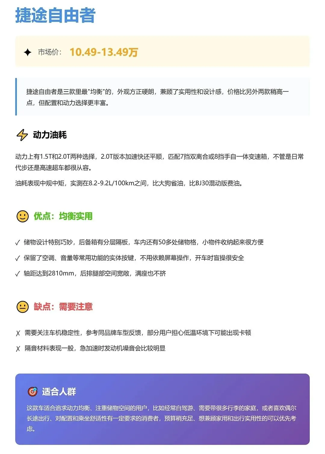 捷途自由者——家用均衡派,“真香定律”潜力股适合:经常自驾游、有娃家庭、后备厢常年堆东西的车主。你对车的要求是:**空间大、储物强、配置好用、动力够用就行**。它的空间和装载能力,是真正能提升幸福感的那种。不适合:你特别迷恋极致个性外观,或者主打极限越野,那自由者就有点太“老实人”了,气质不对路。综合看,**自由者算是这三台里最不容易踩坑的一个,下手就对了。**
