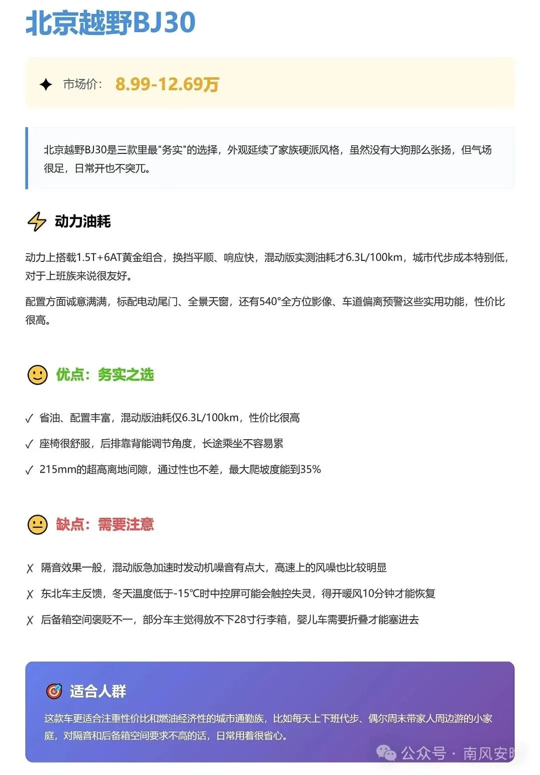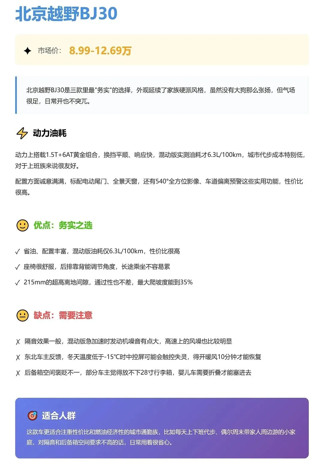 北京越野BJ30——省油务实,“上班族真香车”适合:每天上下班通勤、偶尔周末带家人去郊区小露营、对油耗比较敏感的朋友。**混动版6.3L/100km左右的实测油耗**,在这个体型里真的算顶呱呱,配合一堆实用配置,用起来省心。不适合:特别在意车内静谧感、经常高速长途巡航的用户,BJ30的隔音表现只能说一般,声音敏感星人要慎重。你要是在纠结“省钱通勤+偶尔野一点”,那我真得说一句:**BJ30混动版挺真香的。**