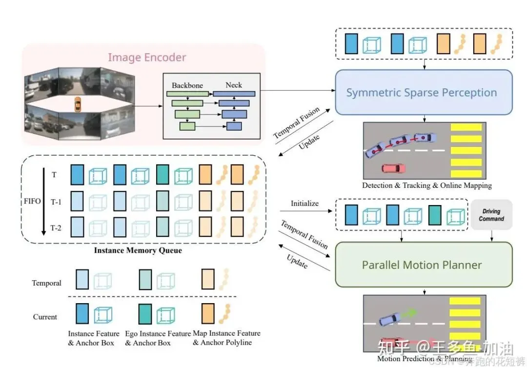 Sparse4D 把“实例 query”同时当3D 检测框、轨迹 ID 和规划障碍物;用递归 attention 完成时序一致性,用稀疏 plan query 直接回归轨迹,从而把“跟踪”和“规划”都压缩进同一条稀疏 query 序列里,端到端可训练,无手工后处理。