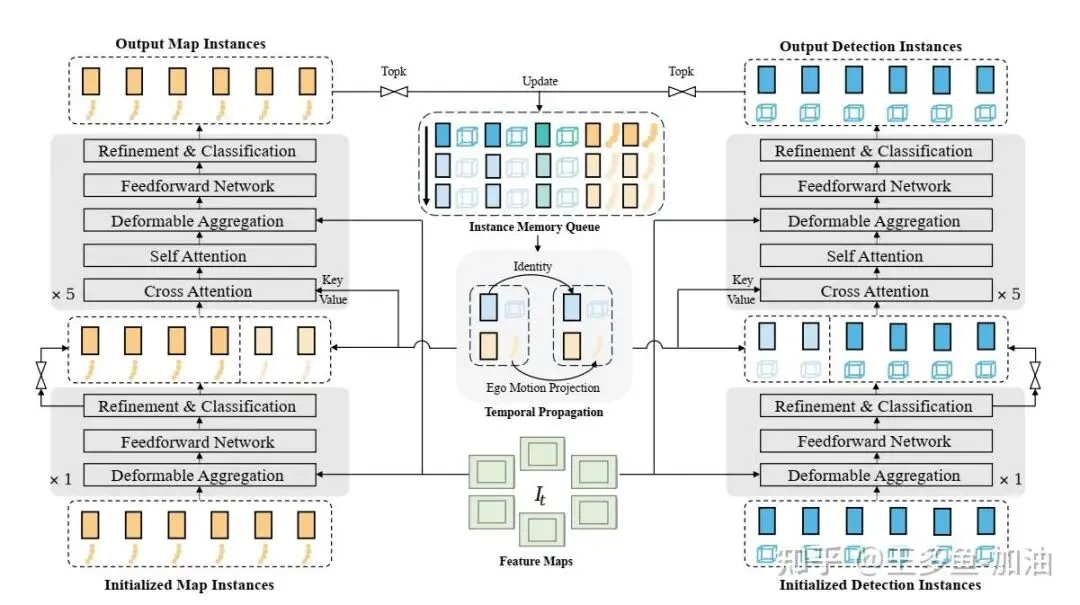 (2)Ego车辆初始化:特征的初始化由于Ego位于车体中心图像盲区,无法直接用Deformable Attention提取图像特征,所以采用前视图最小特征图做平均池化,使用前视图是因为前视图能看到即将进入驾驶路径的环境,是最相关的上下文信息源。Anchor的初始化中位置信息从车辆状态获知,速度部分避免直接使用真实值(防止泄露标签),通过预测前一帧的速度进行初始化,辅助任务预测当前Ego状态(速度、加速度、转向角等)。
