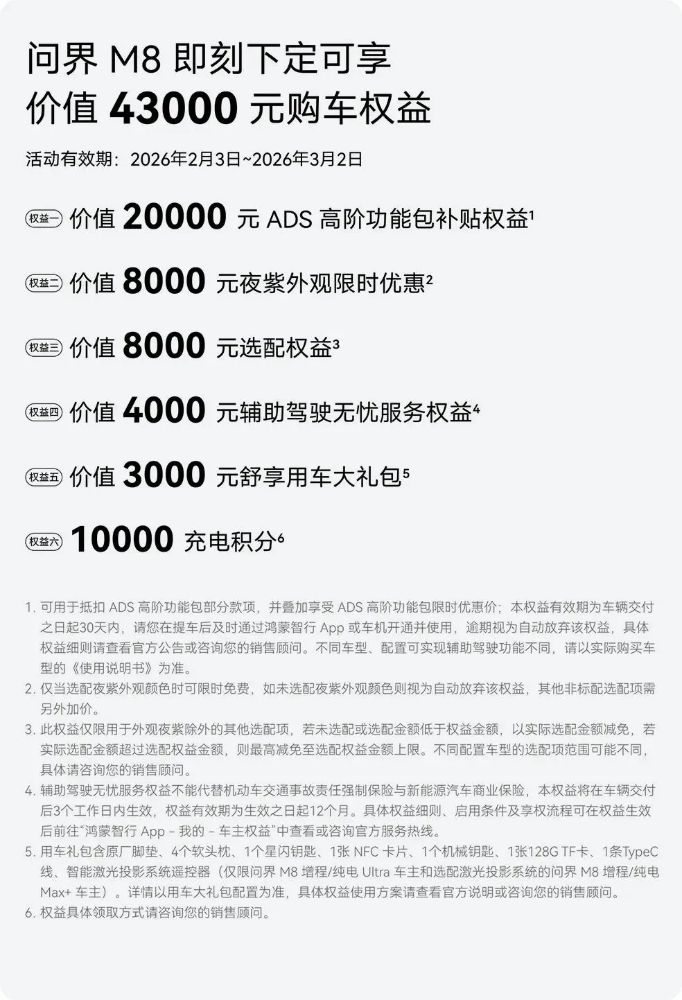 眼看春节就到了,不少家庭都琢磨着添辆新车,不管是返乡路上舒服点,还是走亲访友撑场面,一辆靠谱的家用SUV真的太刚需了。逛了一圈车市,发现问界M8这波新春福利是真的诚意拉满,从现在到3月2号下定,能薅到总价值4.3万的购车权益,算下来省了一大笔,而且这车本身的产品力也很能打,40万级的家用SUV里,真心值得好好看看。