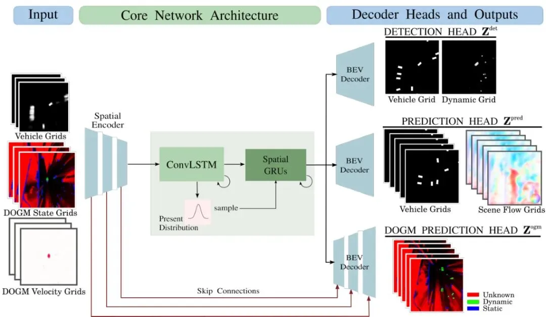 图2:提出的预测框架:输入序列包含车辆栅格、DOGM占据状态栅格和速度栅格。网络预测当前时刻的检测、未来车辆和流序列、以及未来占据状态序列。