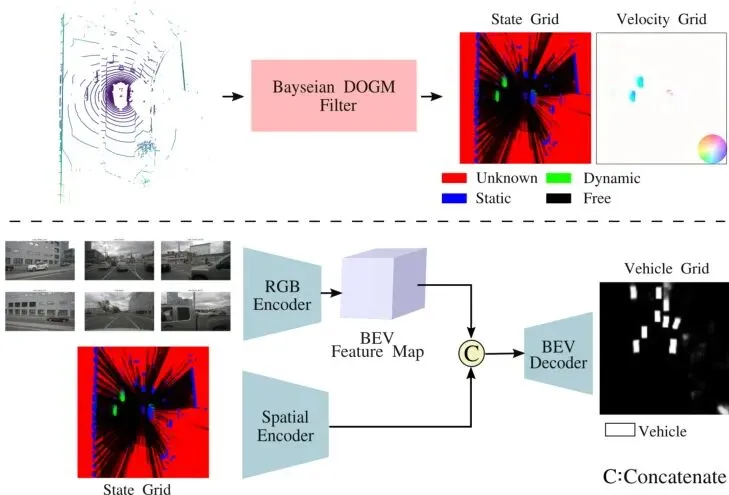 图3:场景表示:DOGM状态和速度栅格由LiDAR数据生成。为融合语义信息,从相机图像编码的BEV特征与占据状态栅格融合,以预测车辆分割栅格。