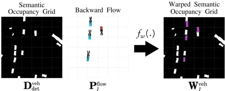 关键操作:基于流的“翘曲”。如图4所示,模型预测的“流”是一种“向后流”,意思是指向上一帧位置的向量。有了这个流和当前时刻检测到的车辆(或动态)格子,我就可以通过一个“翘曲”操作,把当前格子“搬”到它下一帧应该在的位置,从而生成一个预测的未来格子图。