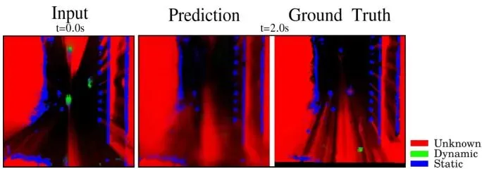 图6:在Nuscenes数据集上,一个快速行驶的自我车辆的未来未知状态栅格预测场景。