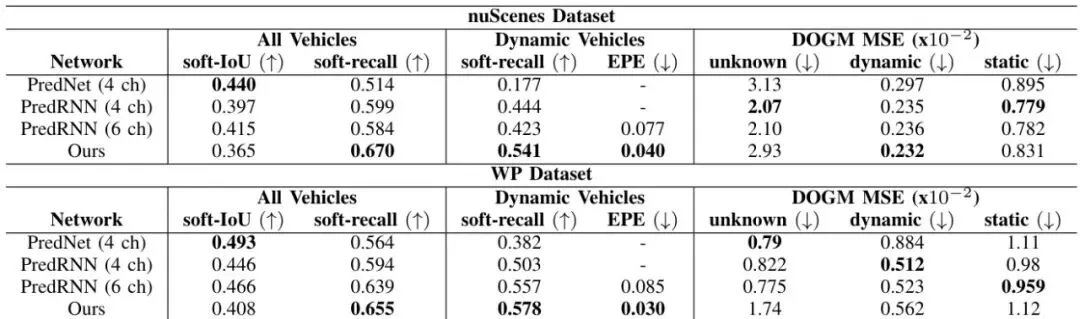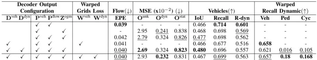 精妙之处:这个“翘曲”出来的未来格子图,要和模型“直接预测”出来的未来车辆图/动态占据图进行比较,计算损失(ℒ𝒲)。这就强迫模型预测的“流”必须是准确的,否则“翘曲”结果就对不上。同时,“流”本身的预测也有损失(ℒF)。此外,每个解码头都有自己的监督损失,比如车辆预测用交叉熵损失ℒP,DOGM预测用均方误差损失ℒOGM。