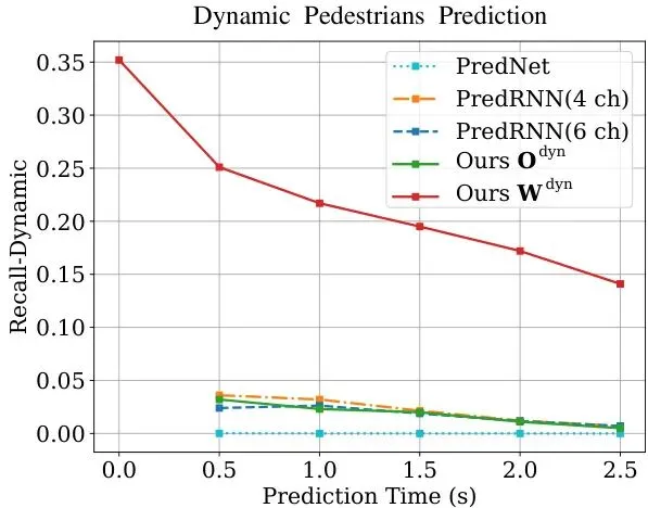 图7:在nuScenes数据集上突出显示通用代理预测能力的行人动态召回率曲线。在DOGM动态通道和本方法的翘曲动态栅格上计算了不同预测网络的动态行人召回率。
