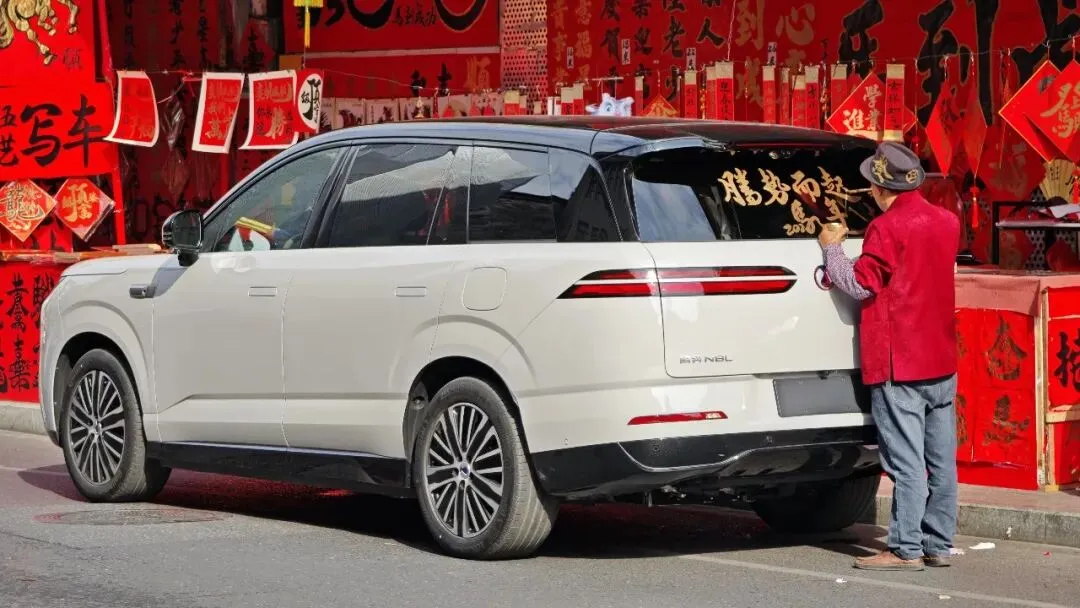 这要是普通大SUV,早就在巷子里“卡壳”了:要么得喊人帮忙指挥,要么倒来倒去蹭掉车漆。但腾势N8L的后轮转向像给车加了个“灵活buff”,转弯半径比很多紧凑级SUV还小。我开着它穿过卖福字的摊位,路过写春联的桌子,甚至能在书法师傅的案台边停稳,让他在车身上写“吉祥如意”——旁边的大叔凑过来问:“你这台车这么大,怎么这么好开?”我笑着说:“它会‘走猫步’。”